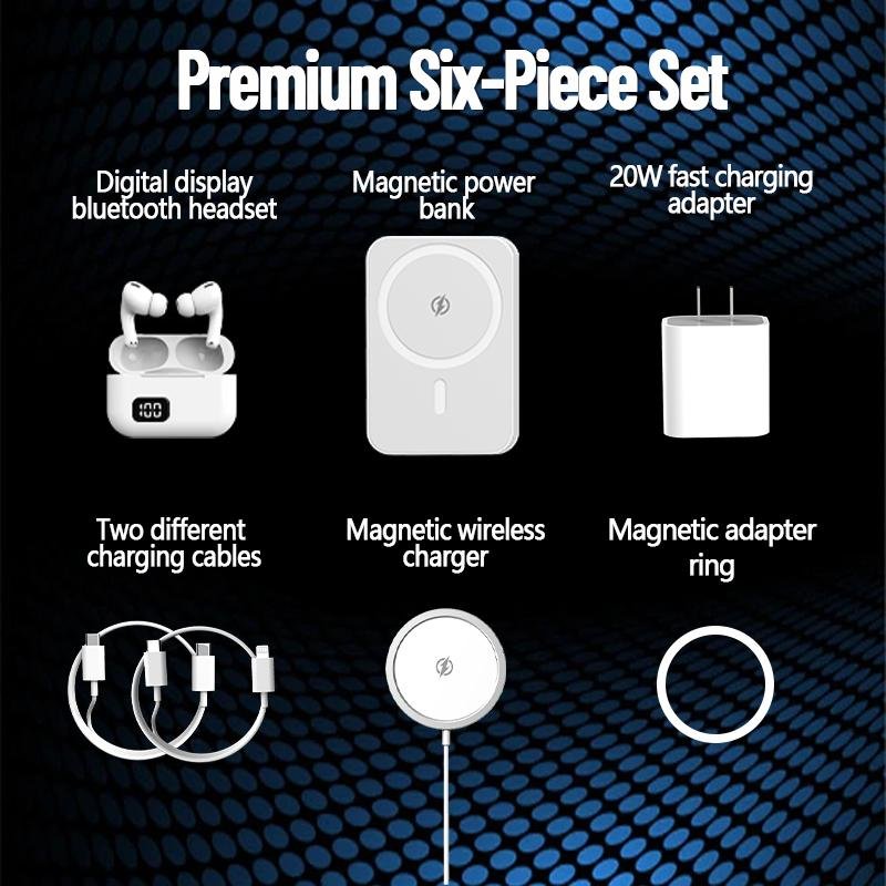 6-in-1 Charging Kit: Fast Charge, Magnetic Power Bank, Wireless Charger, Type-C to Lightning Cable, Adapter & Audio Support, Compact & Portable.